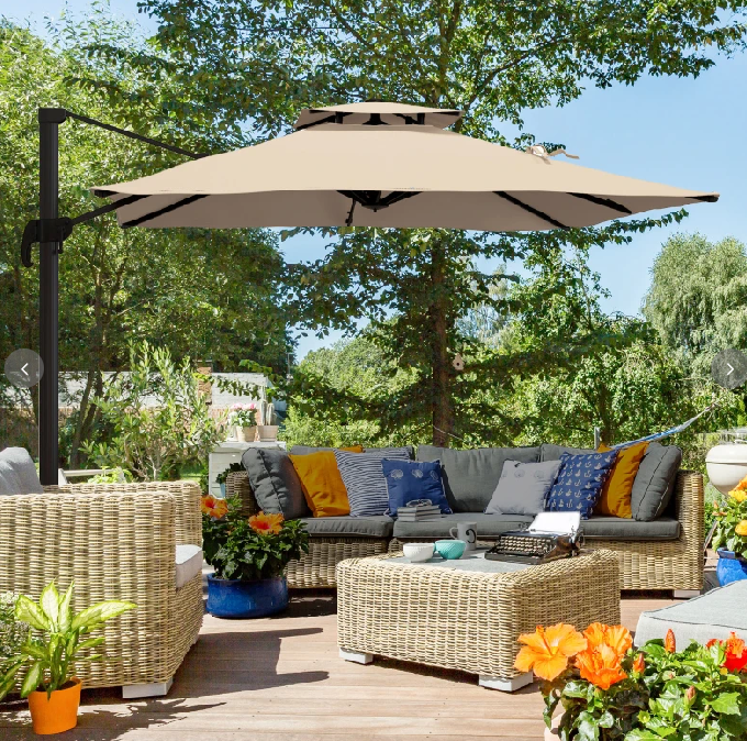 - Doppeldachkonstruktion: Das quadratische Dach des Ampelschirms ist groß genug, um optimalen Schatten zu bieten. Das obere Dach sorgt für gute Luftzirkulation und Wärmeableitung