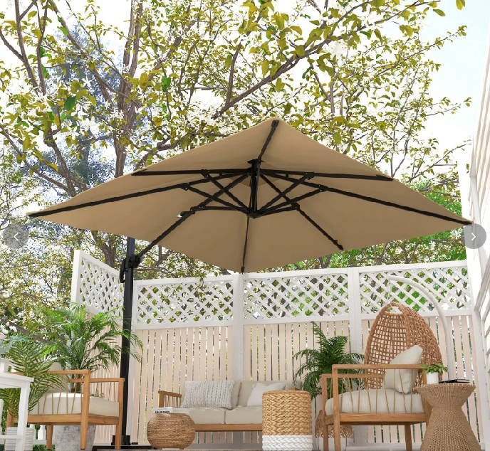 - Drehbarkeit um 360 Grad: Mit dem Kreuzfuß und dem Fußpedal zur Steuerung der Drehung kann der Schirm um 360 Grad gedreht werden, um die Kontrolle über den zu beschattenden Bereich zu erleichtern. (Bitte beachten: Im Lieferumfang ist nur ein Kreuzfuß enthalten, kein Gegengewichtsfuß. Es wird empfohlen, ein Gegengewicht von mindestens 60 kg zu verwenden.)