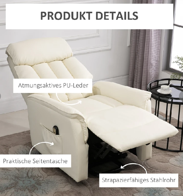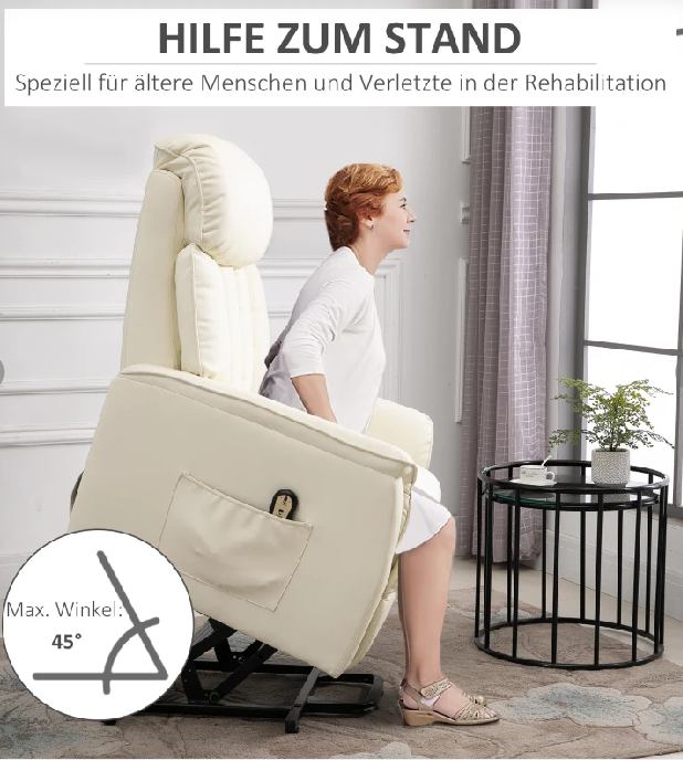 - Aufstehhilfe: Der Hubstuhl mit einem maximalen Hubwinkel von 45° bietet allen, die Schwierigkeiten beim Aufstehen haben, eine kraftvolle Aufstehhilfe. Gut geeignet für ältere Menschen, Menschen mit einer Hüft- oder Beinverletzung oder für alle, die es benötigen.