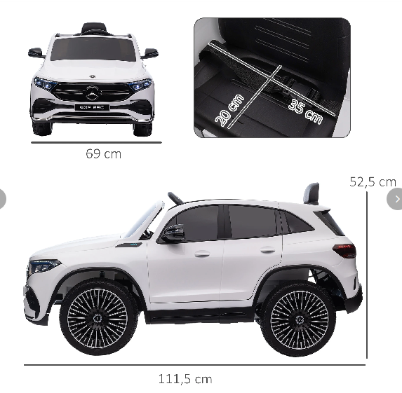 - Lizenzierter Elektro-Mercedes-Benz EQA: Unser lizenzierter elektrischer Mercedes ist ideal für jeden kleinen Fahranfänger oder jede kleine -anfängerin. Der 12V-Akku lässt sich bequem herausnehmen und aufladen