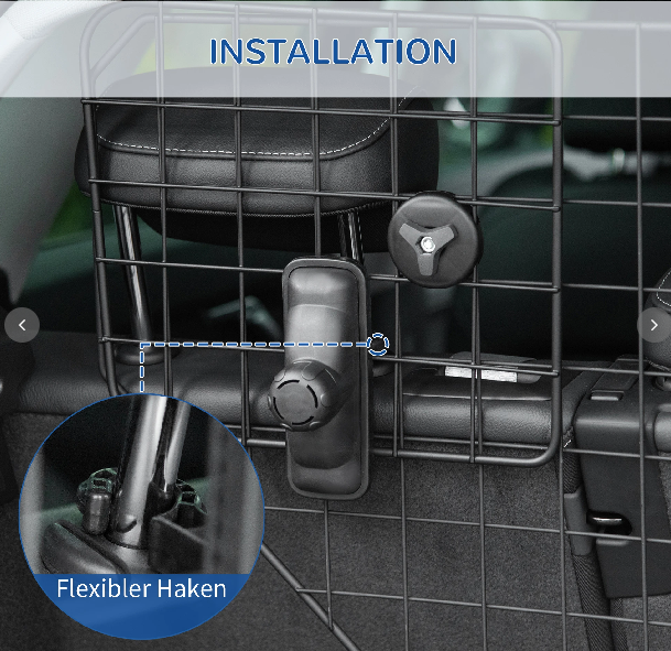 - Einfache Befestigung: Mithilfe der Kunststoffhaken kann das Schutzgitter schnell und schonend ohne Werkzeug im Inneren des Wagens angebracht werden.