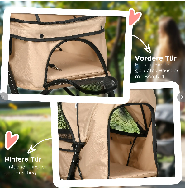 - Grosser Korb: Viel Platz für Ihr Haustier zum Ausruhen, geschützt durch ein verstellbares Verdeck. Das Hundebuggy hat Mesh-Fenster, für eine gute Belüftung. Tür mit Reißverschluss bietet einen leichten Zugang und zwei Sicherheitsleinen sorgen für zusätzliche Sicherheit.