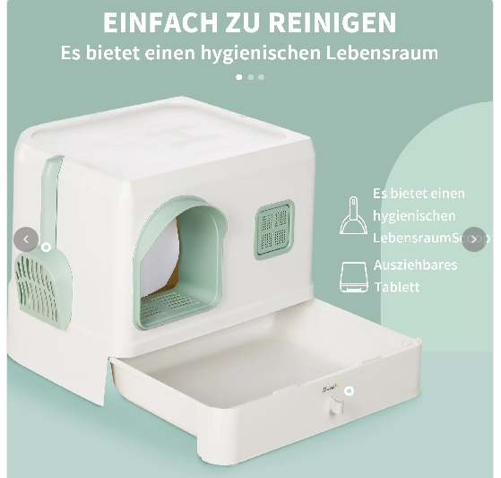 - Leicht zu reinigen: Eine Schaufel zur Reinigung des Katzenklos ist im Lieferumfang enthalten. Ziehen Sie die Bodenwanne heraus und reinigen Sie diese. Befestigen Sie die Schaufel an der Seite, damit Sie sie nicht verlieren.