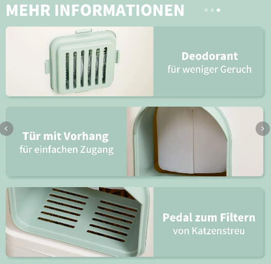 - Vermeidet Streuverlust: Die Vorhänge am Eingang verhindern, dass die Katzen die Streu heraustragen und ermöglicht Ihren Katzen einen einfachen Zugang ins Innere der Katzentoilette.
