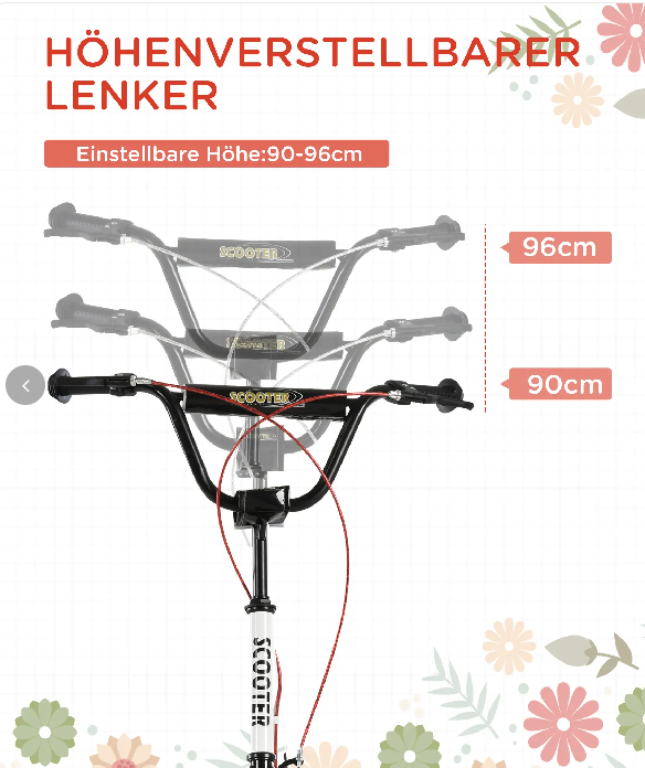 - Einstellbare Höhe: Der voll verstellbare Lenker kann auf verschiedene Höhenanforderungen angepasst werden. Die Höhe des Kinderscooters kann auf 90-96H cm eingestellt werden, so dass dieser Roller mit Ihrem Kind mitwachsen kann!
