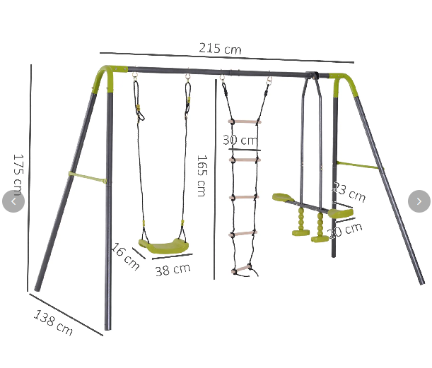 - PRODUKTDATEN: Gesamtmaße: 215/295L x 138B x 175 H cm, Maße Schaukel: B38 x T16 cm, Maße Wippe: B20 x T23 cm, Maße der Leiter: 165L x 30B cm