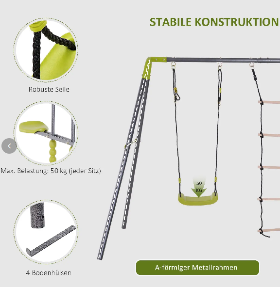 - DAUERHAFT UND STABIL: Mit der langlebigen A-Rahmen-Konstruktion ist dieses Metall-Schaukel-Set sicher, sodass Ihr Kind unbedenklich damit spielen kann. Der pulverbeschichtete Metallrahmen sorgt für jahrelange Freude am Gebrauch. Ideal für die Platzierung im Garten