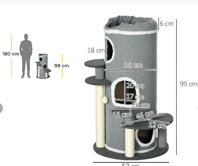 - Abmessungen des Katzenkratzbaums: Ø57 x 99H cm. Geeignet für 1-2 Katzen . Montage erforderlich