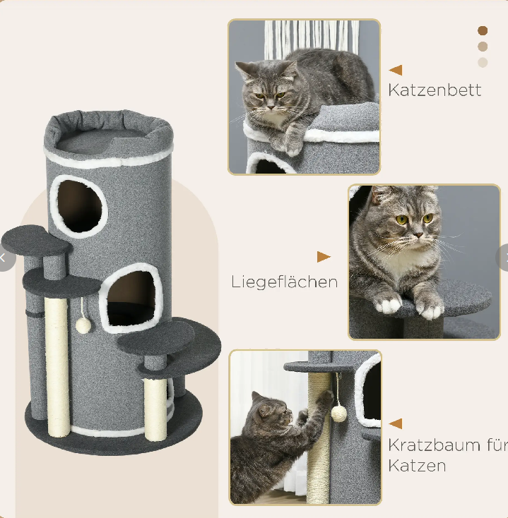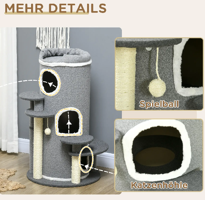 - Vielseitiges Design: Enthält einen Kratzbaum mit 3 Ebenen, 4 Liegeflächen und ein oberes Katzenbett. Er ist leicht zu betreten und zu verlassen und bietet somit ein wahres Katzenparadies zum Spielen
