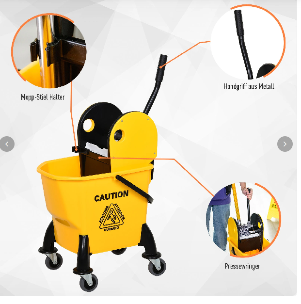 - Robust: Der Putzeimer mit Rollen ist aus stabilem, langlebigem Kunststoff gefertigt, der Handgriff besteht aus Metall.