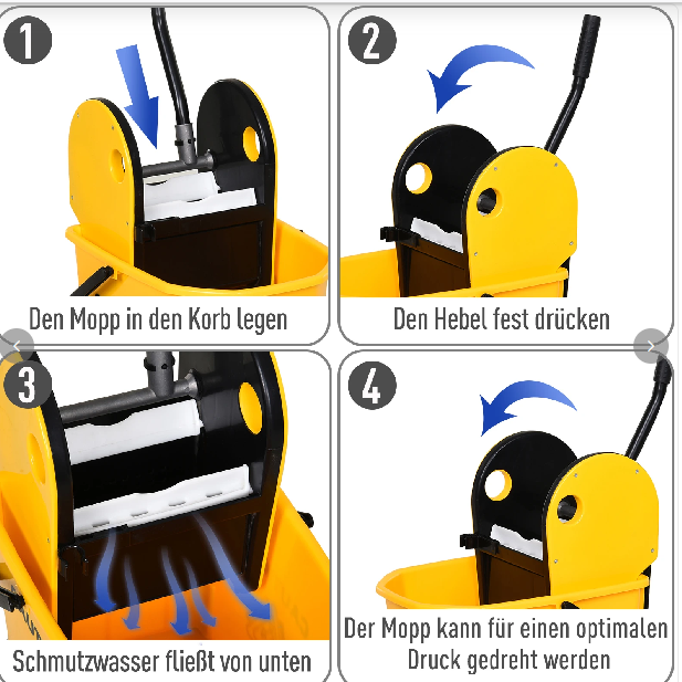 - Einfach: Die Auswringvorrichtung drückt das überschüssige Wasser schnell und effektiv aus dem verwendeten Wischmop. Hinweis: Im Lieferumfang ist kein Wischmop enthalten.