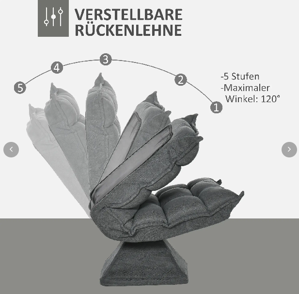- 360° verstellbare Rückenlehne: Verstellbare Rückenlehne bis max. 120°. Der Bodenstuhl ist um 360° drehbar, das Stahlgestell sorgt für einen sicheren und stabilen Stand