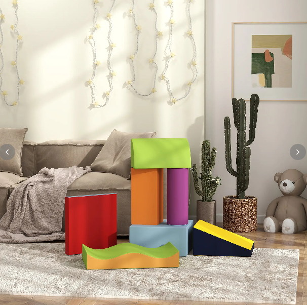 - Weiche Schaumstoffbausteine: Mit drei Quadern, einer Rampe, einem Wellen-Element, einem Zylinder und einem Viertelzylinder können Kinder sicher laufen, springen und krabbeln. Ideal für aktive und sichere Spielstunden.
