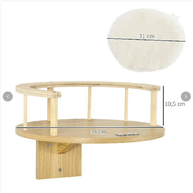 - Produktdaten: Gesamtmaße: Ø34 x 10,5H cm (ohne Befestigung). Maße des Liegekissens: Ø31 x 3T cm. Geeignet für Katzen bis 5 kg. Montage erforderlich.